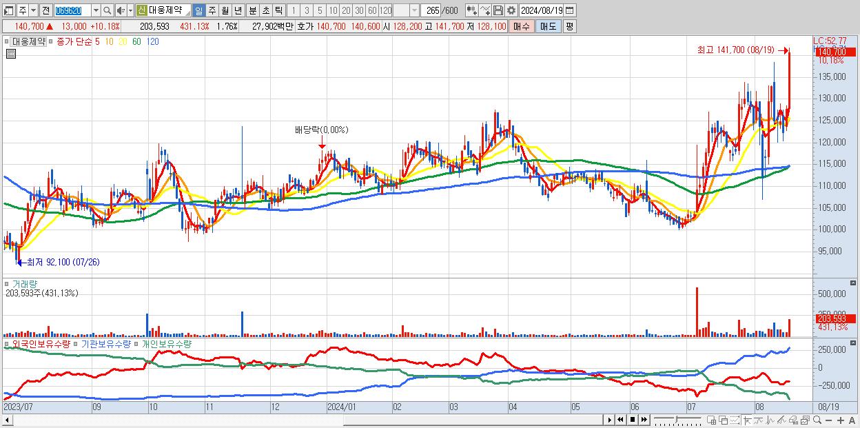 - 대웅제약 (140,700원 ▲ 10.18% , 시총: 16,302억, 외국인 순매수 거래금:36억)