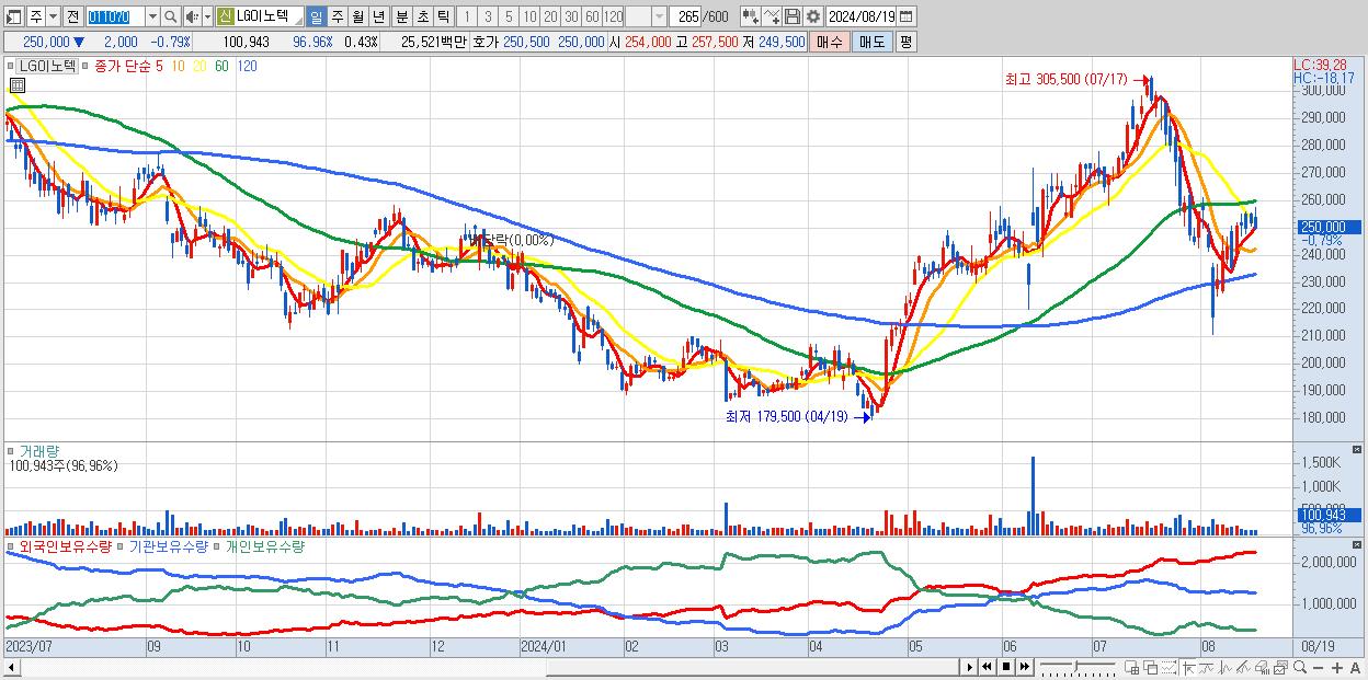 - LG이노텍 (250,000원 ▼ -0.79% , 시총: 59,168억, 외국인 순매수 거래금:42억)