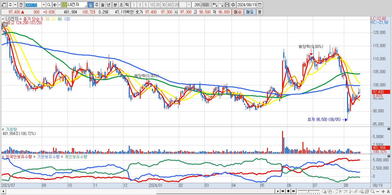 - LG전자 (97,400원 ▲ 0.83% , 시총: 159,393억, 외국인 순매수 거래금:103억)