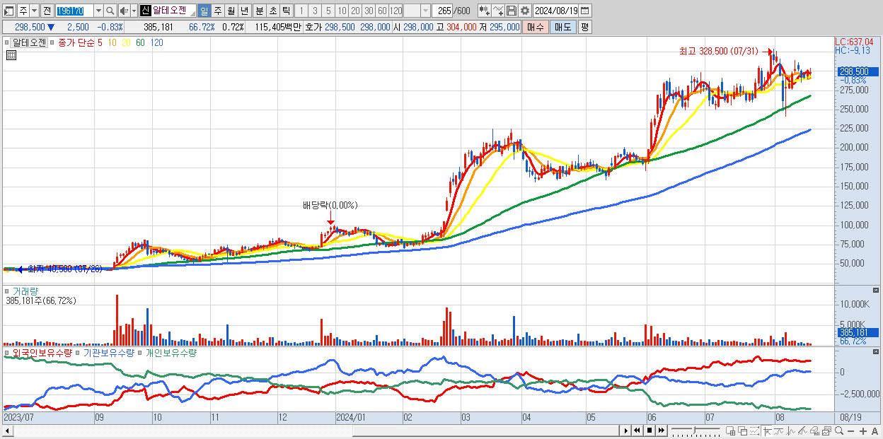 - 알테오젠 (298,500원 ▼ -0.83% , 시총: 158,648억, 외국인 순매수 거래금:56억)
