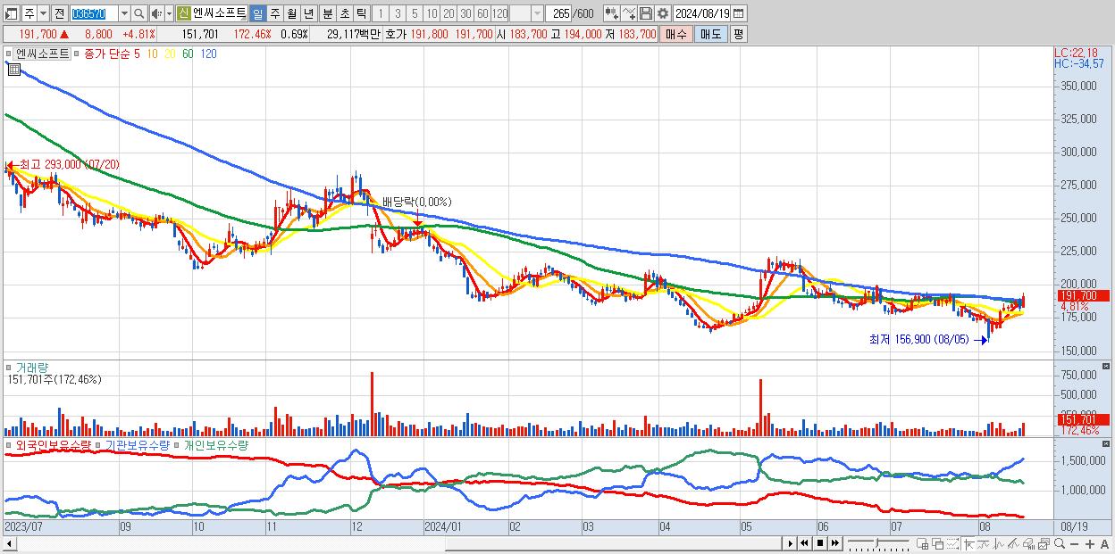 - 엔씨소프트 (191,700원 ▲ 4.81% , 시총: 42,086억, 외국인 순매수 거래금:39억)