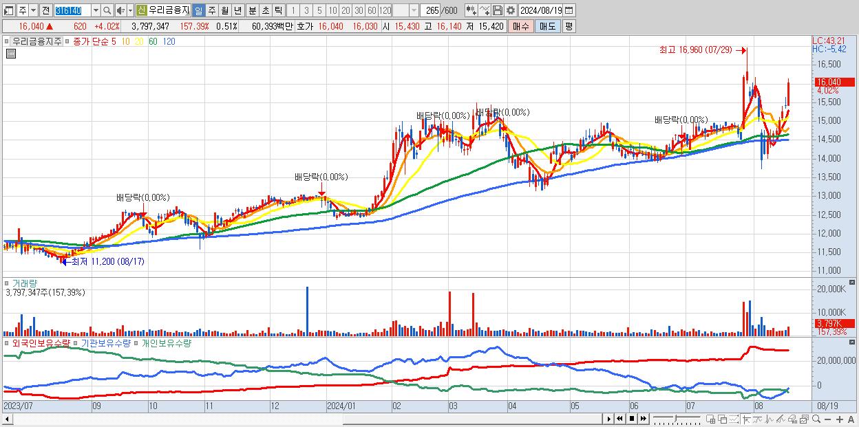 - 우리금융지주 (16,040원 ▲ 4.02% , 시총: 119,112억, 외국인 순매수 거래금:129억)