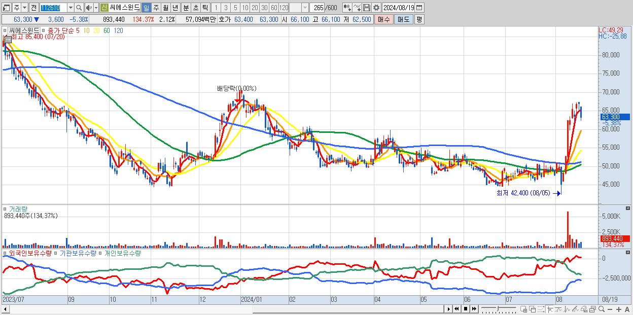 - 씨에스윈드 (63,300원 ▼ -5.38% , 시총: 26,694억, 외국인 순매수 거래금:112억)