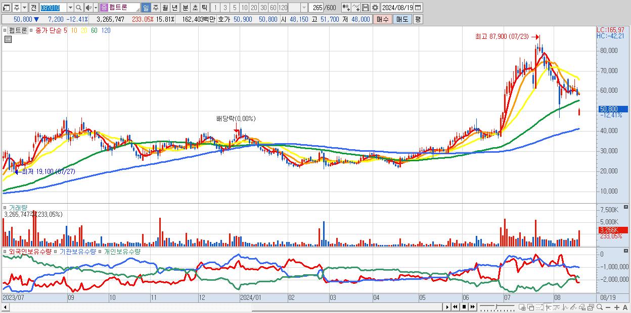 - 펩트론 (50,800원 ▼ -12.41% , 시총: 10,494억, 외국인 순매수 거래금:52억)