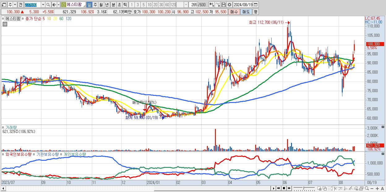- 에스티팜 (100,300원 ▲ 5.58% , 시총: 19,741억, 외국인 순매수 거래금:50억)