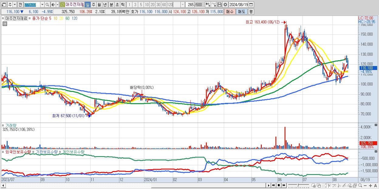 - 대주전자재료 (116,100원 ▼ -4.99% , 시총: 17,973억, 외국인 순매수 거래금:42억)