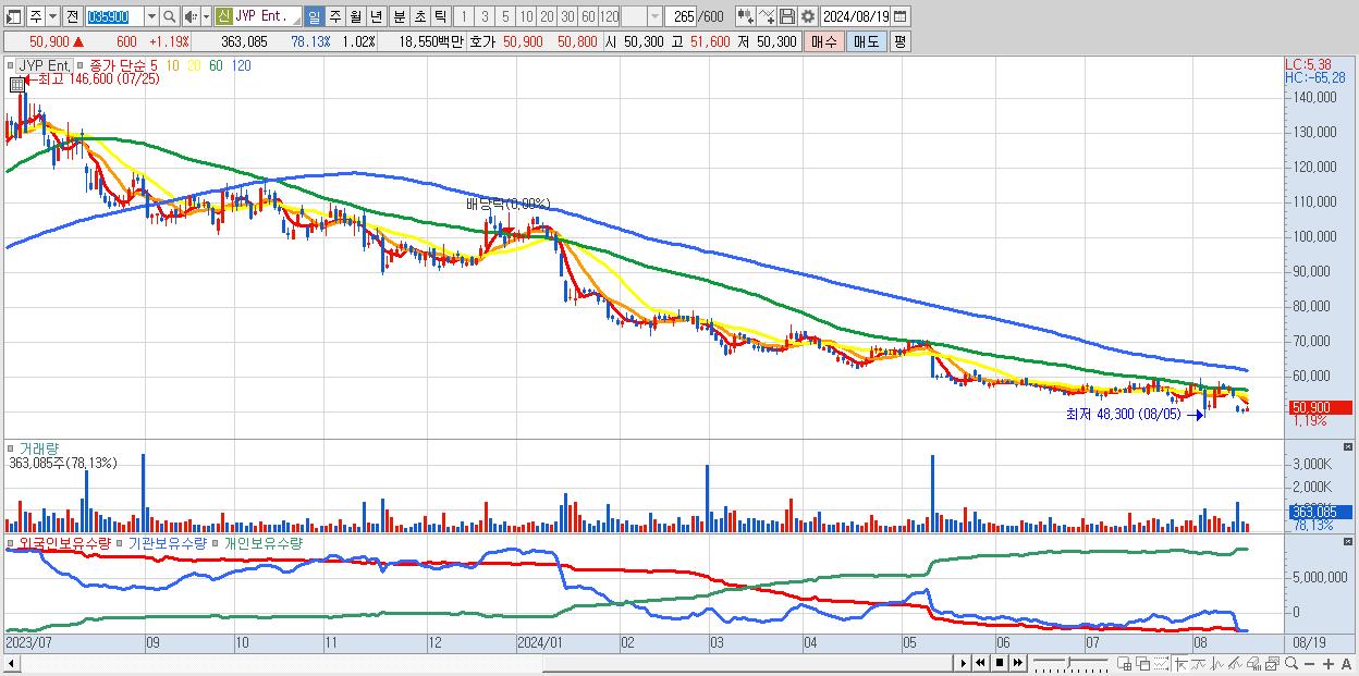 - JYP Ent. (50,900원 ▲ 1.19% , 시총: 18,086억, 외국인 순매수 거래금:39억)