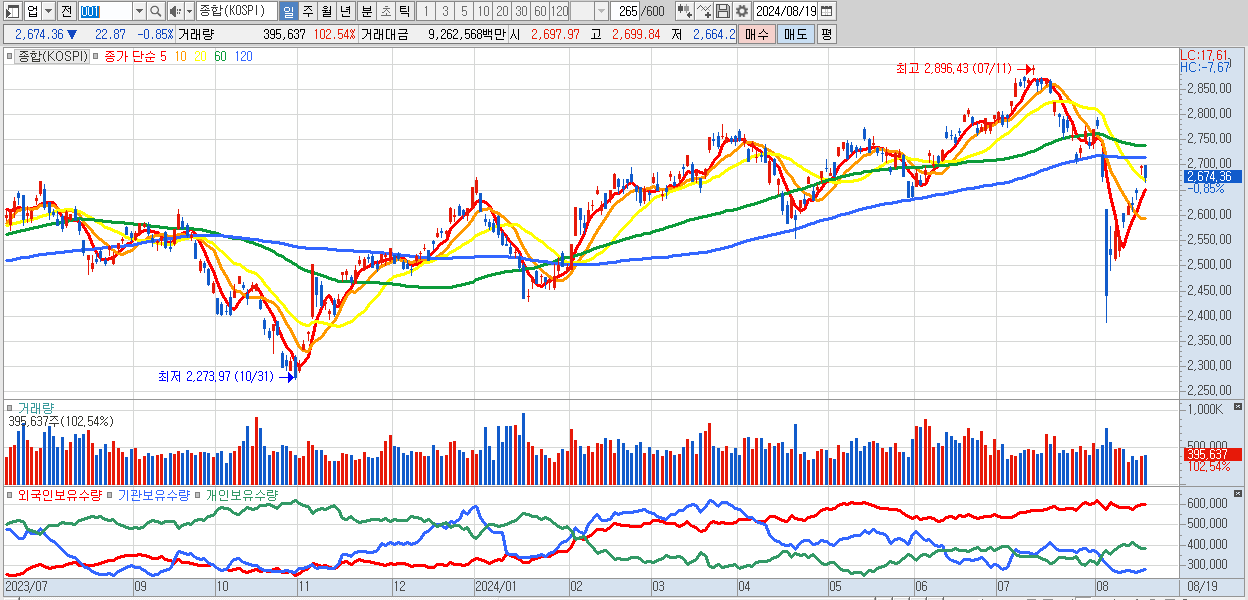 08/19 | 2,674.36 | ▼-0.85% | 1,387억 | -1,176억 | -155억 | -56억 |