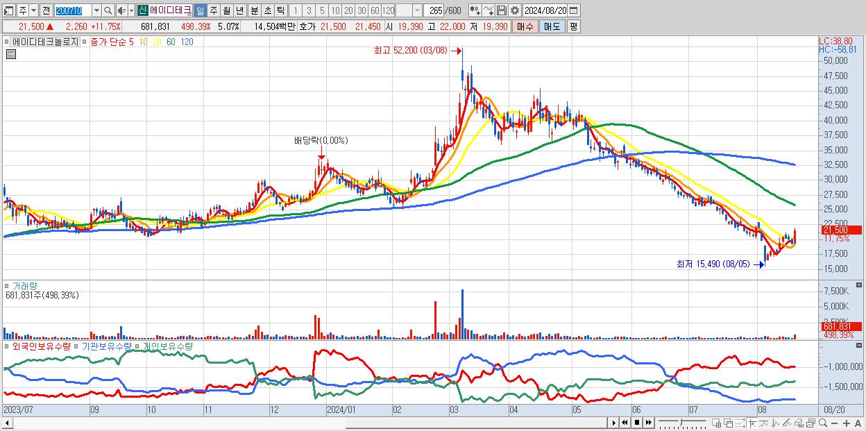 - 에이디테크놀로지 (21,500원 ▲ 11.75% , 시총: 2,890억, 거래량: 681,831, 거래대금:145억)