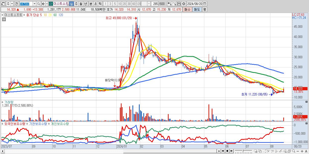 - 이스트소프트 (14,320원 ▲ 13.38% , 시총: 1,662억, 거래량: 1,281,177, 거래대금:185억)