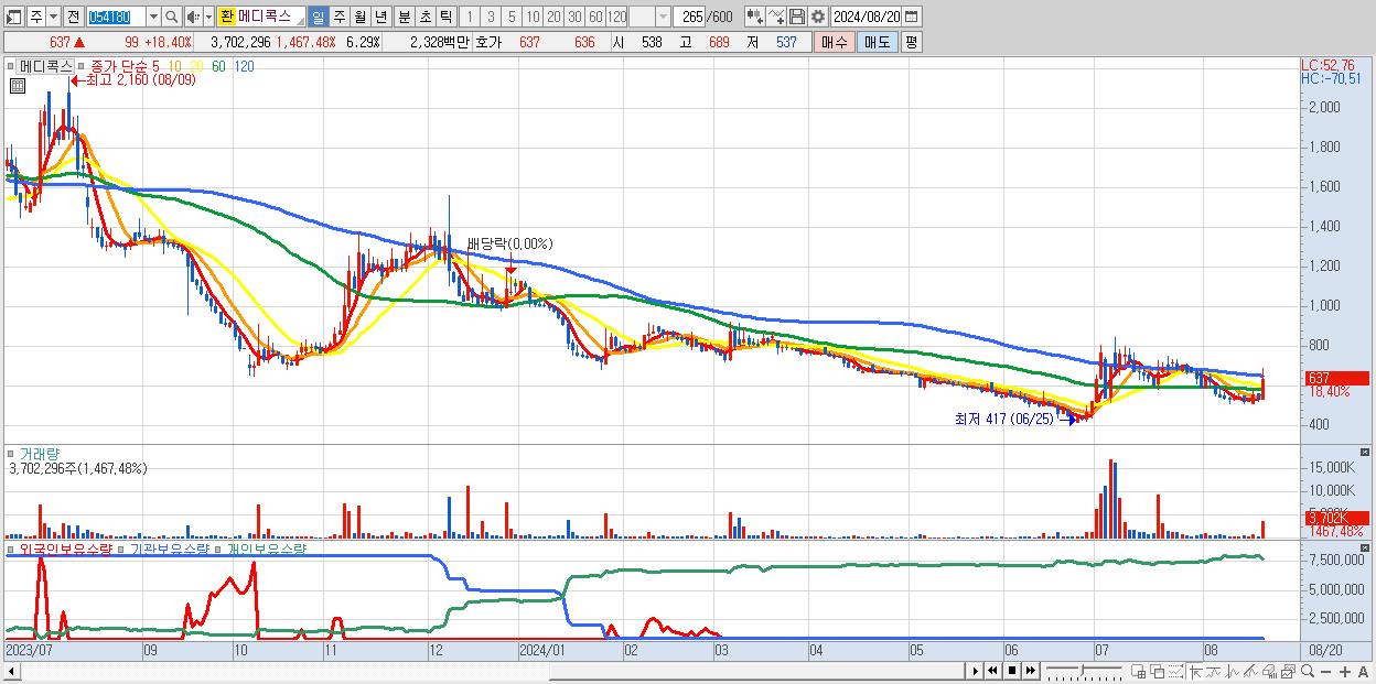 - 메디콕스 (637원 ▲ 18.4% , 시총: 375억, 거래량: 3,702,296, 거래대금:23억)