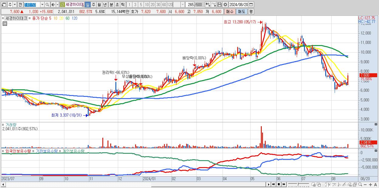 - 세경하이테크 (7,600원 ▲ 15.68% , 시총: 2,725억, 거래량: 2,041,011, 거래대금:151억)