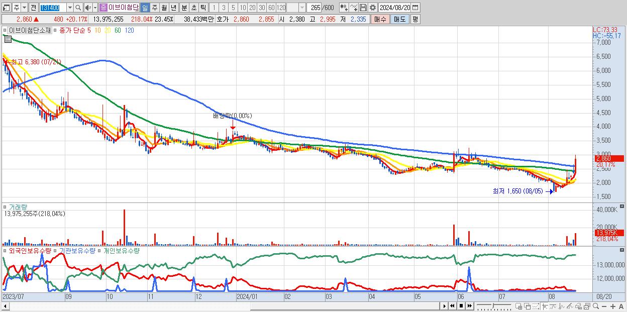 - 이브이첨단소재 (2,860원 ▲ 20.17% , 시총: 1,704억, 거래량: 13,975,255, 거래대금:384억)