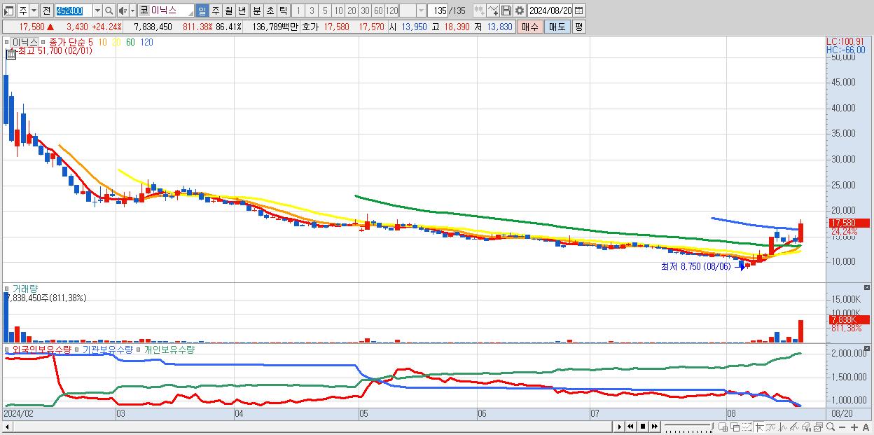 - 이닉스 (17,580원 ▲ 24.24% , 시총: 1,595억, 거래량: 7,838,450, 거래대금:1,368억)