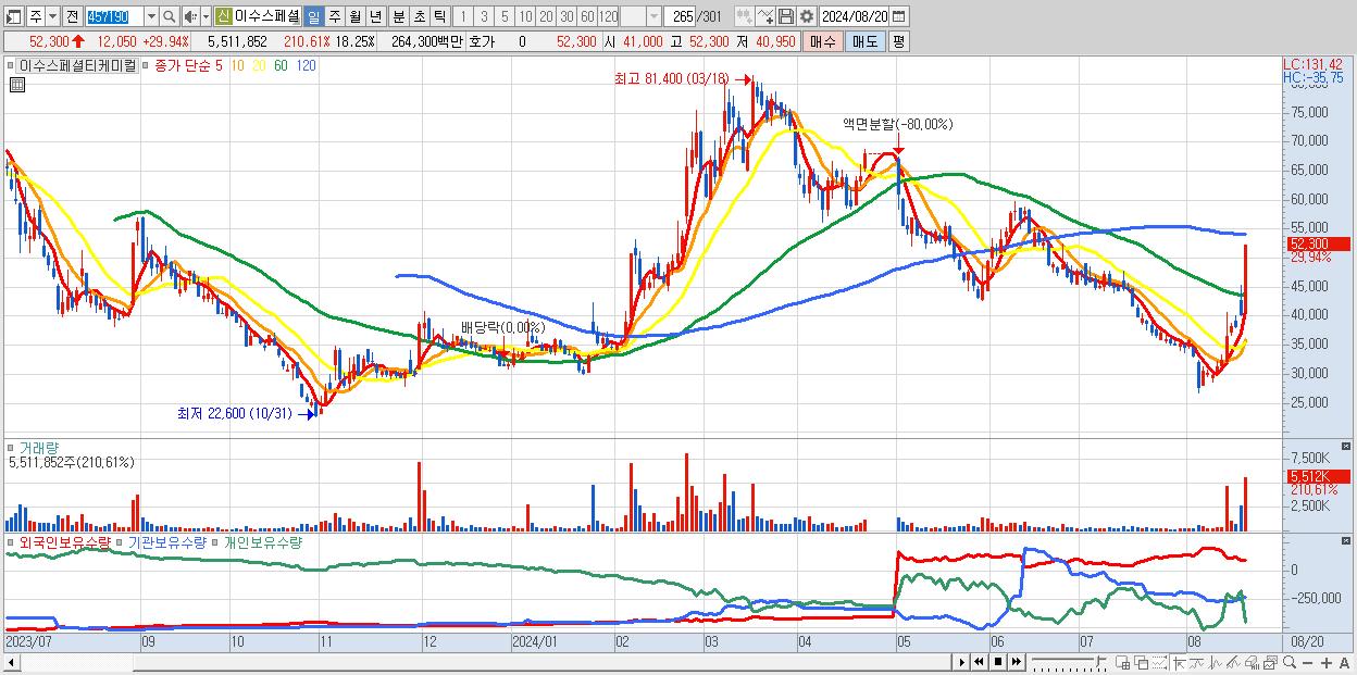 - 이수스페셜티케미컬 (52,300원 ▲ 29.94% , 시총: 15,799억, 거래량: 5,511,852, 거래대금:2,643억)