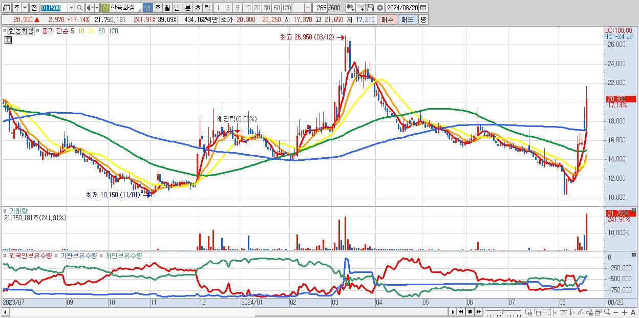 - 한농화성 (20,300원 ▲ 17.14% , 시총: 3,174억, 거래량: 21,750,181, 거래대금:4,342억)