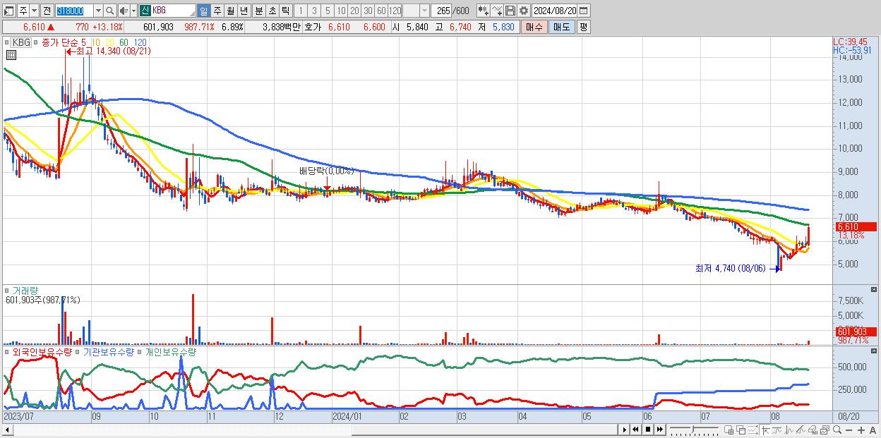 - KBG (6,610원 ▲ 13.18% , 시총: 578억, 거래량: 601,903, 거래대금:38억)