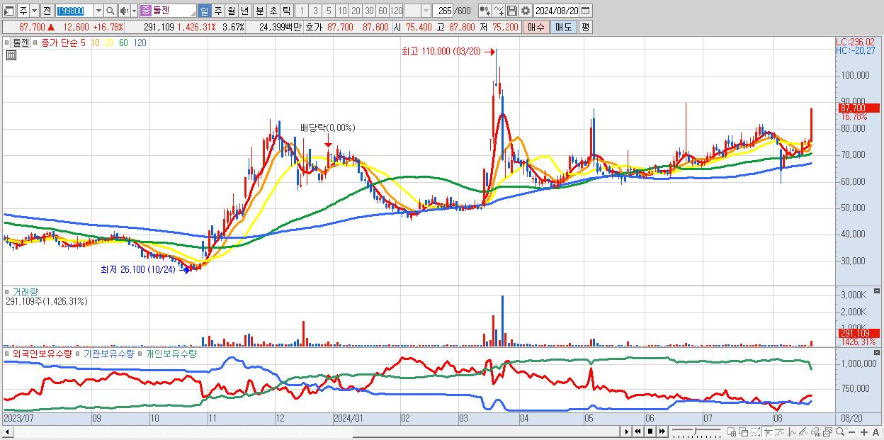 - 툴젠 (87,700원 ▲ 16.78% , 시총: 6,964억, 거래량: 291,109, 거래대금:244억)