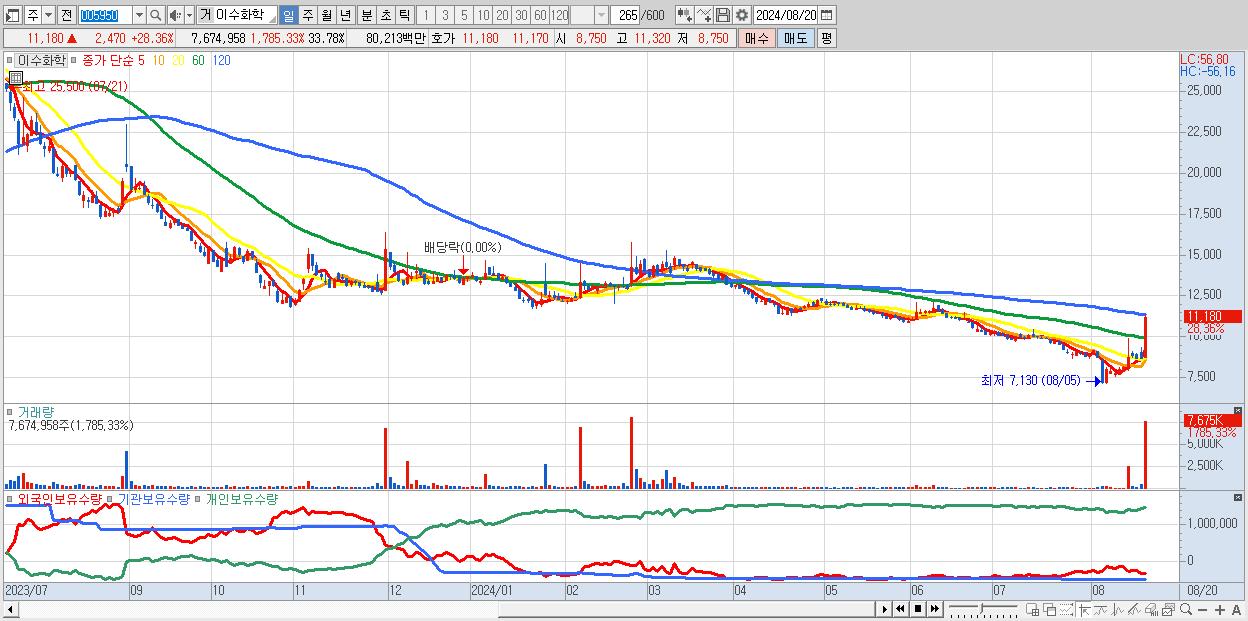 - 이수화학 (11,180원 ▲ 28.36% , 시총: 2,540억, 거래량: 7,674,958, 거래대금:802억)