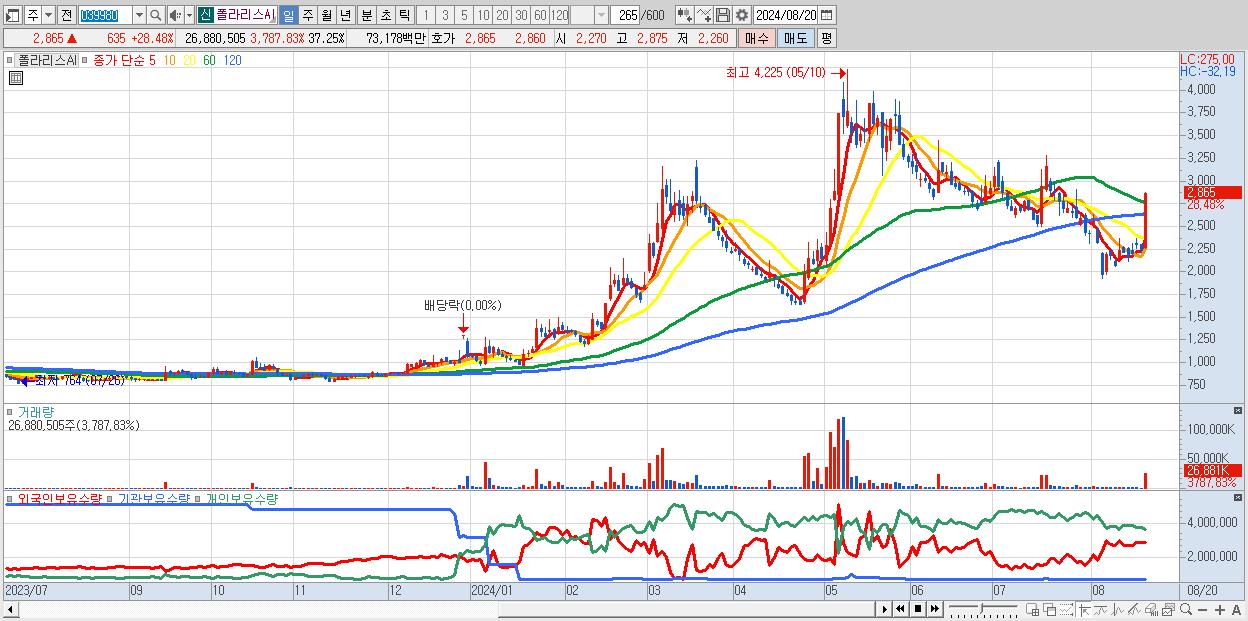 - 폴라리스AI (2,865원 ▲ 28.48% , 시총: 2,067억, 거래량: 26,880,505, 거래대금:732억)