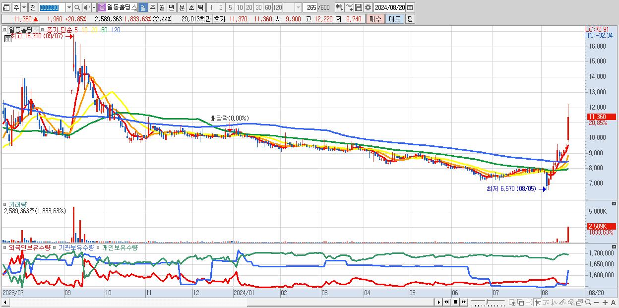 - 일동홀딩스 (11,360원 ▲ 20.85% , 시총: 1,311억, 거래량: 2,589,363, 거래대금:290억)