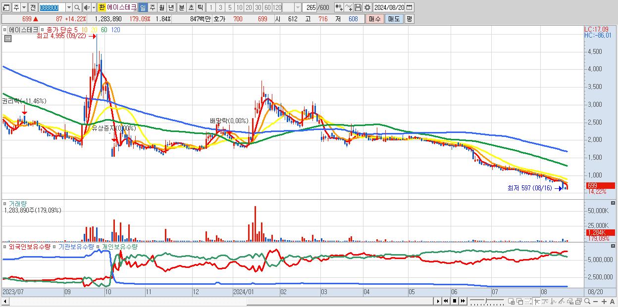 - 에이스테크 (699원 ▲ 14.22% , 시총: 489억, 거래량: 1,283,890, 거래대금:8억)