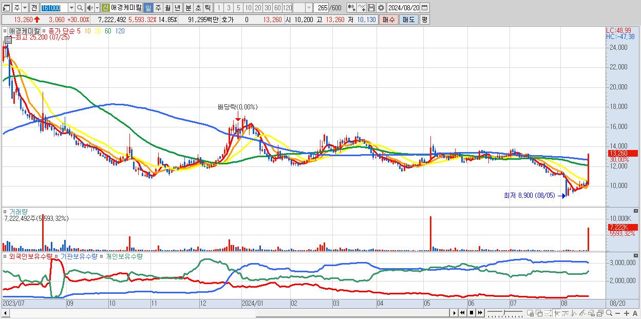 - 애경케미칼 (13,260원 ▲ 30% , 시총: 6,451억, 거래량: 7,222,492, 거래대금:913억)