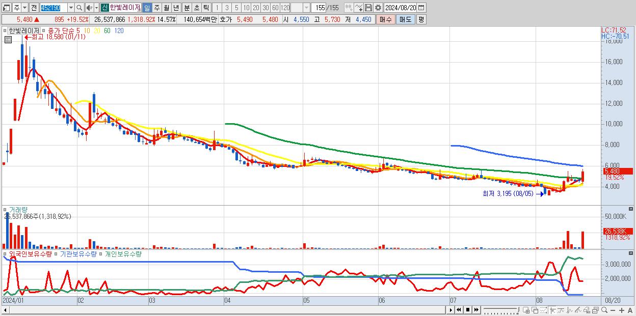 - 한빛레이저 (5,480원 ▲ 19.52% , 시총: 1,269억, 거래량: 26,537,866, 거래대금:1,407억)