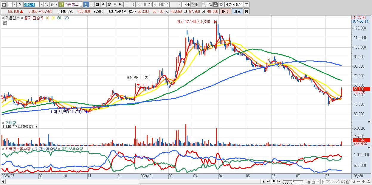 - 가온칩스 (56,100원 ▲ 16.75% , 시총: 6,445억, 거래량: 1,146,725, 거래대금:634억)