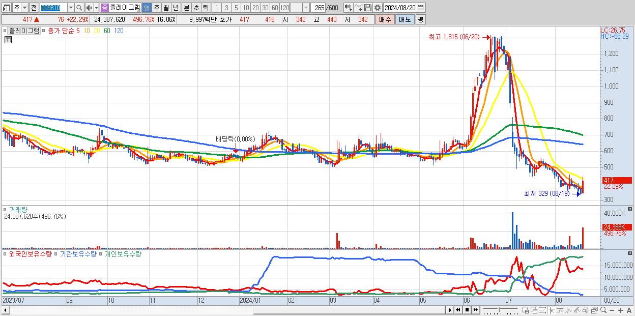 - 플레이그램 (417원 ▲ 22.29% , 시총: 633억, 거래량: 24,387,620, 거래대금:100억)