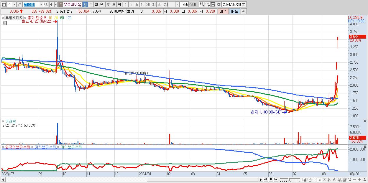 - 우정바이오 (3,585원 ▲ 29.89% , 시총: 533억, 거래량: 2,621,247, 거래대금:91억)
