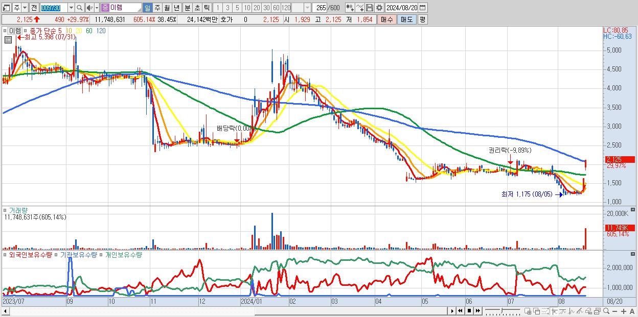 - 이렘 (2,125원 ▲ 29.97% , 시총: 649억, 거래량: 11,748,631, 거래대금:241억)