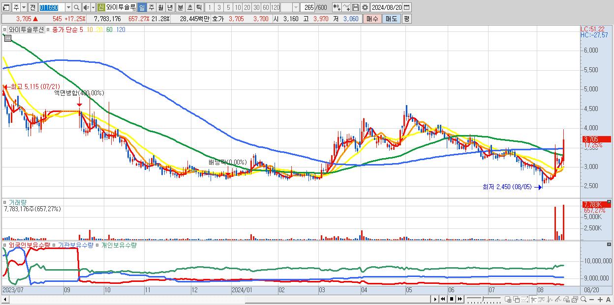 - 와이투솔루션 (3,705원 ▲ 17.25% , 시총: 1,355억, 거래량: 7,783,176, 거래대금:284억)