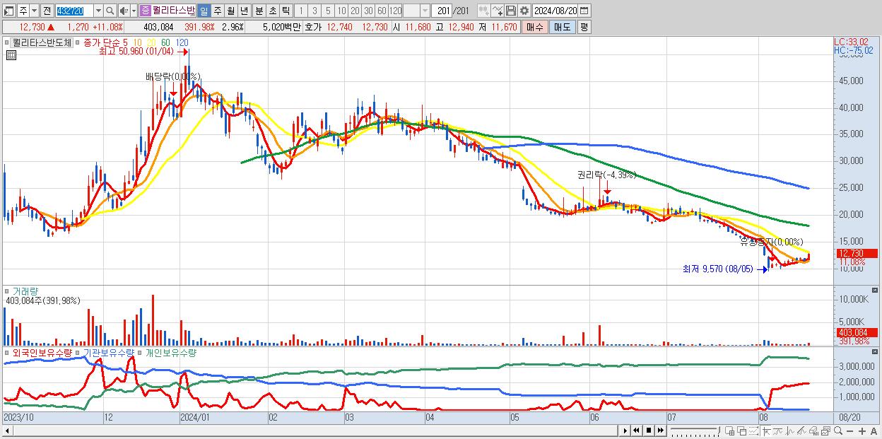 - 퀄리타스반도체 (12,730원 ▲ 11.08% , 시총: 1,734억, 거래량: 403,084, 거래대금:50억)