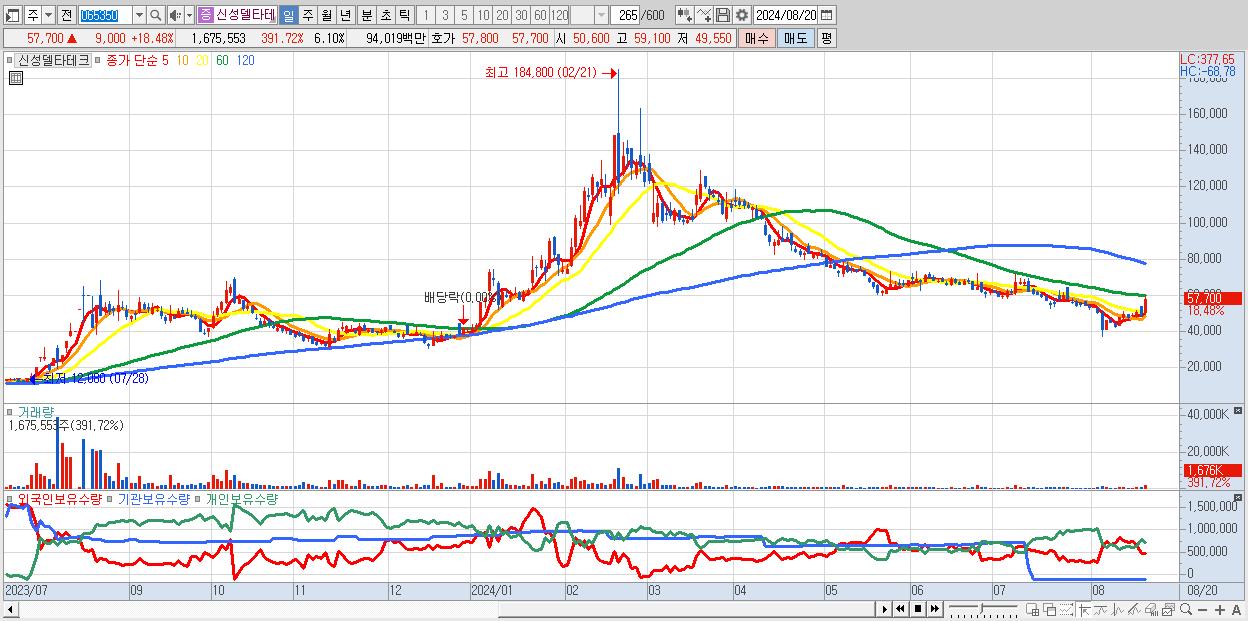 - 신성델타테크 (57,700원 ▲ 18.48% , 시총: 15,858억, 거래량: 1,675,553, 거래대금:940억)
