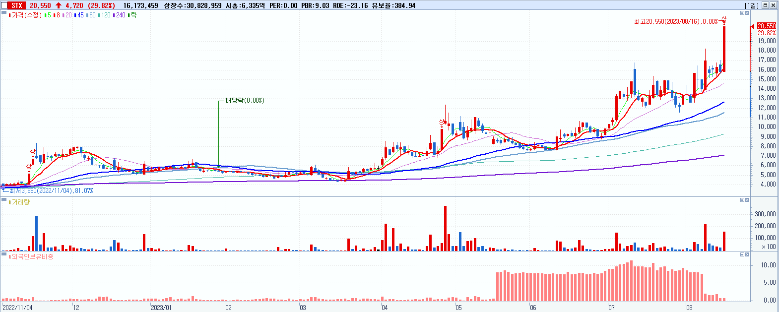 - STX (20,550원 ▲ 29.82% , 시총: 6,335억, 거래량: 16,174,065, 거래대금:3,016억, KOSPI)