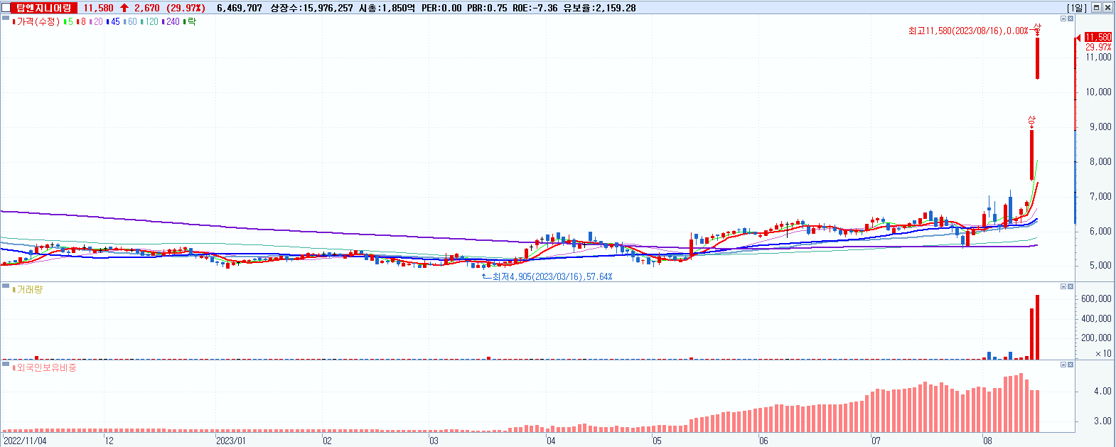 탑엔지니어링 11,580원 ▲ 29.97% (KOSDAQ, 065130)