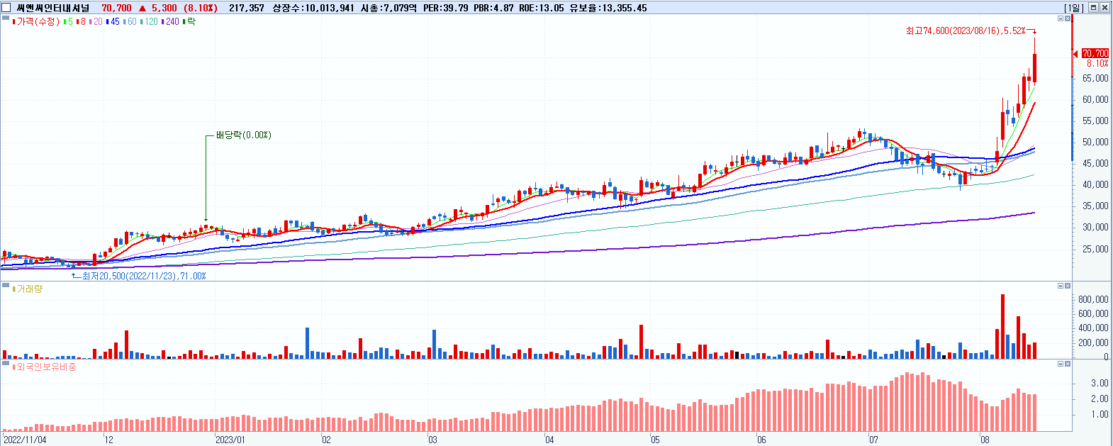 - 씨앤씨인터내셔널 (70,700원 ▲ 8.1% , 시총: 7,080억, 거래량: 217,358, 거래대금:148억, KOSDAQ)