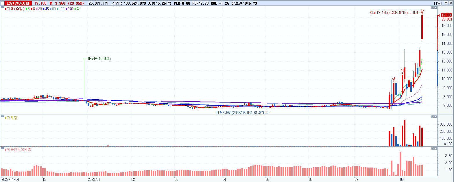LS전선아시아 17,180원 ▲ 29.95% (KOSPI, 229640)