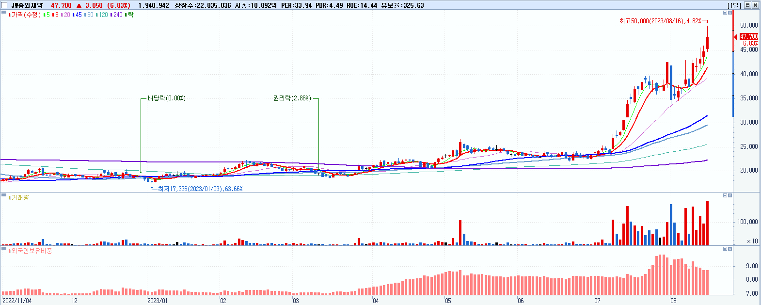 - JW중외제약 (47,700원 ▲ 6.83% , 시총: 10,892억, 거래량: 1,942,108, 거래대금:930억, KOSPI)