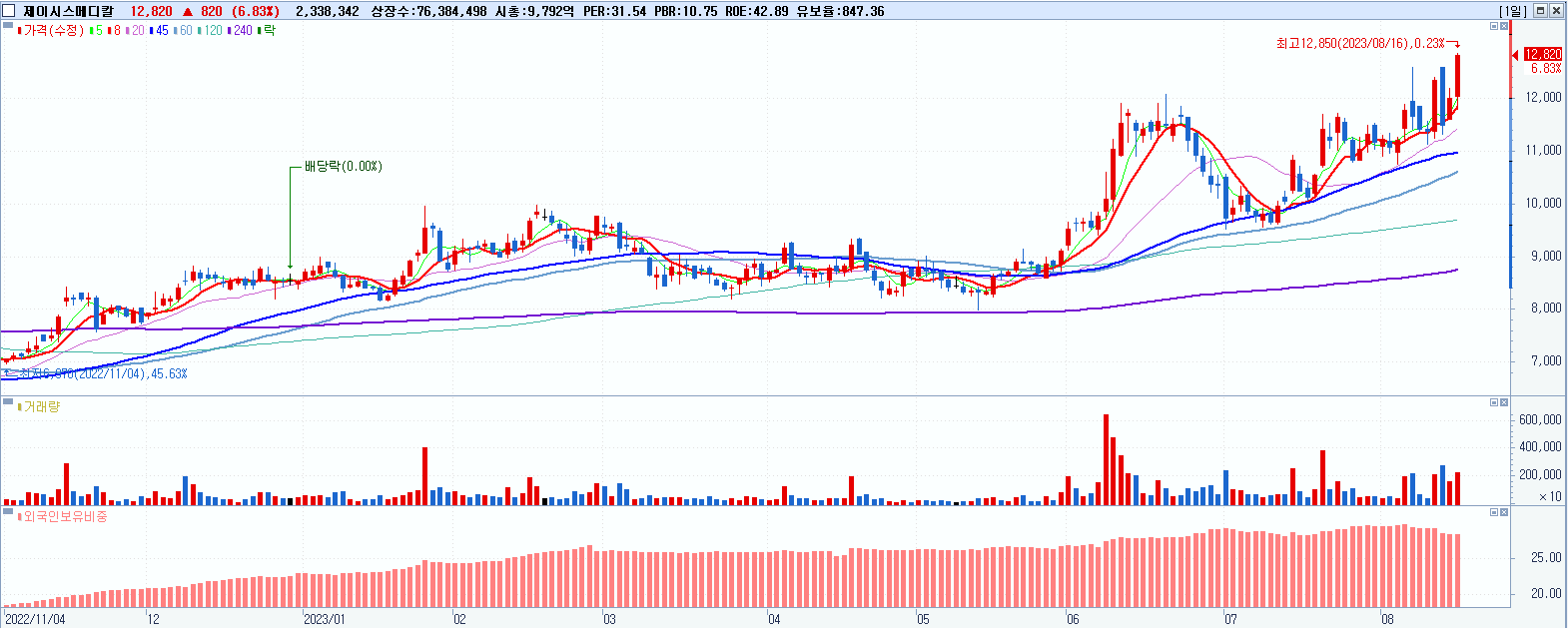 - 제이시스메디칼 (12,820원 ▲ 6.83% , 시총: 9,792억, 거래량: 2,338,913, 거래대금:292억, KOSDAQ)