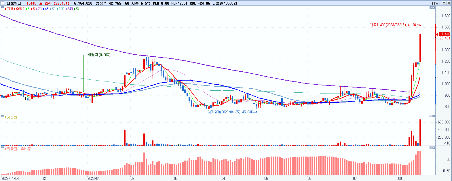 - 다보링크 (1,440원 ▲ 22.45% , 시총: 616억, 거래량: 6,768,262, 거래대금:94억, KOSDAQ)