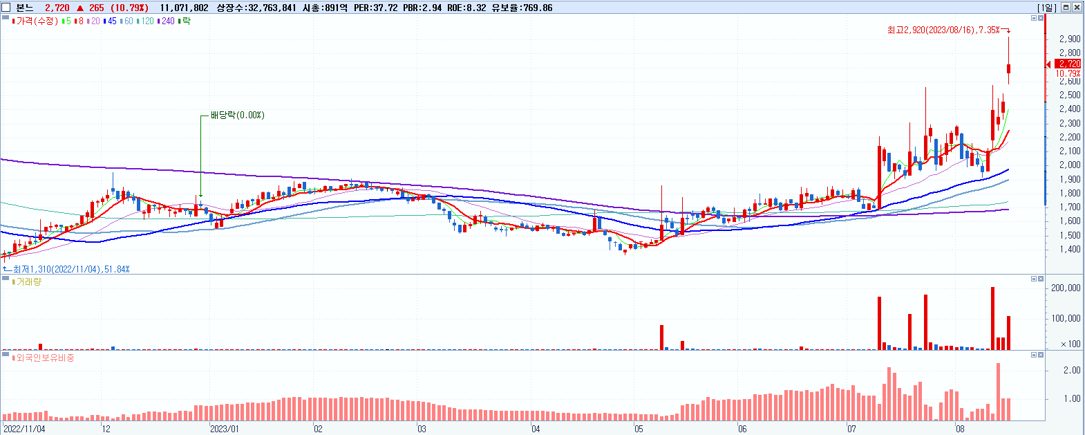- 본느 (2,720원 ▲ 10.79% , 시총: 891억, 거래량: 11,072,242, 거래대금:309억, KOSDAQ)