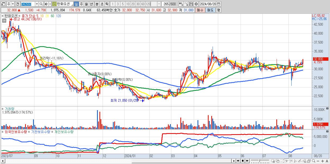 - 한화오션 (32,800원 ▲ 4.79% , 시총: 100,504억, 외국인 순매수 거래금:175억)