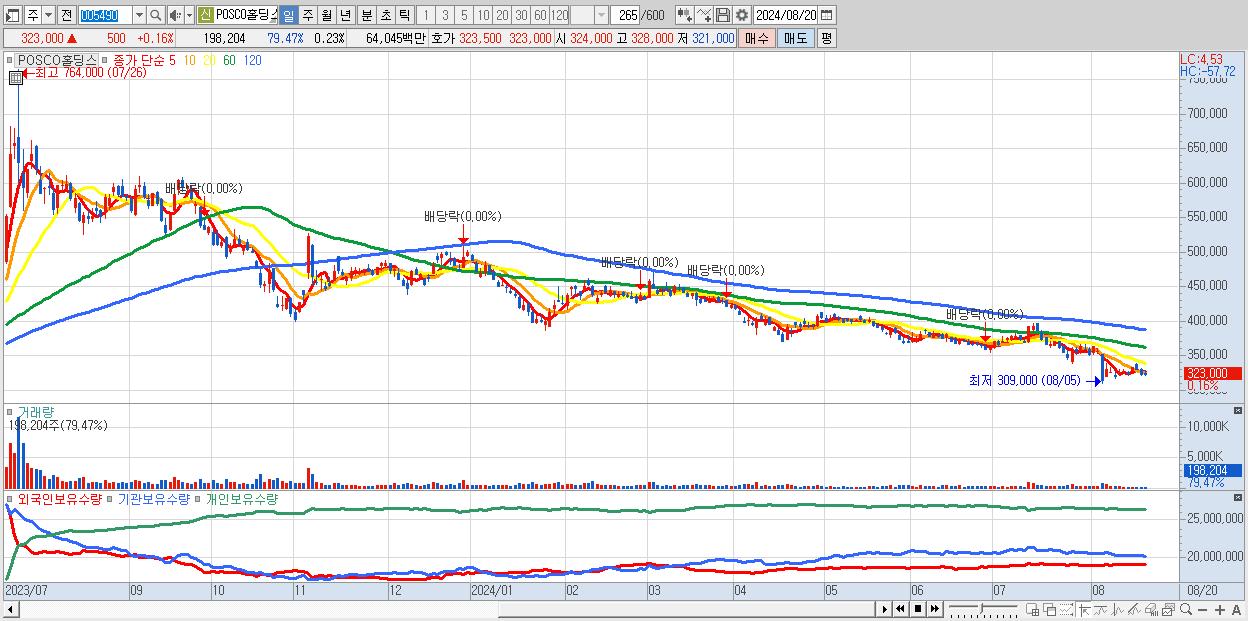 - POSCO홀딩스 (323,000원 ▲ 0.16% , 시총: 273,165억, 외국인 순매수 거래금:59억)
