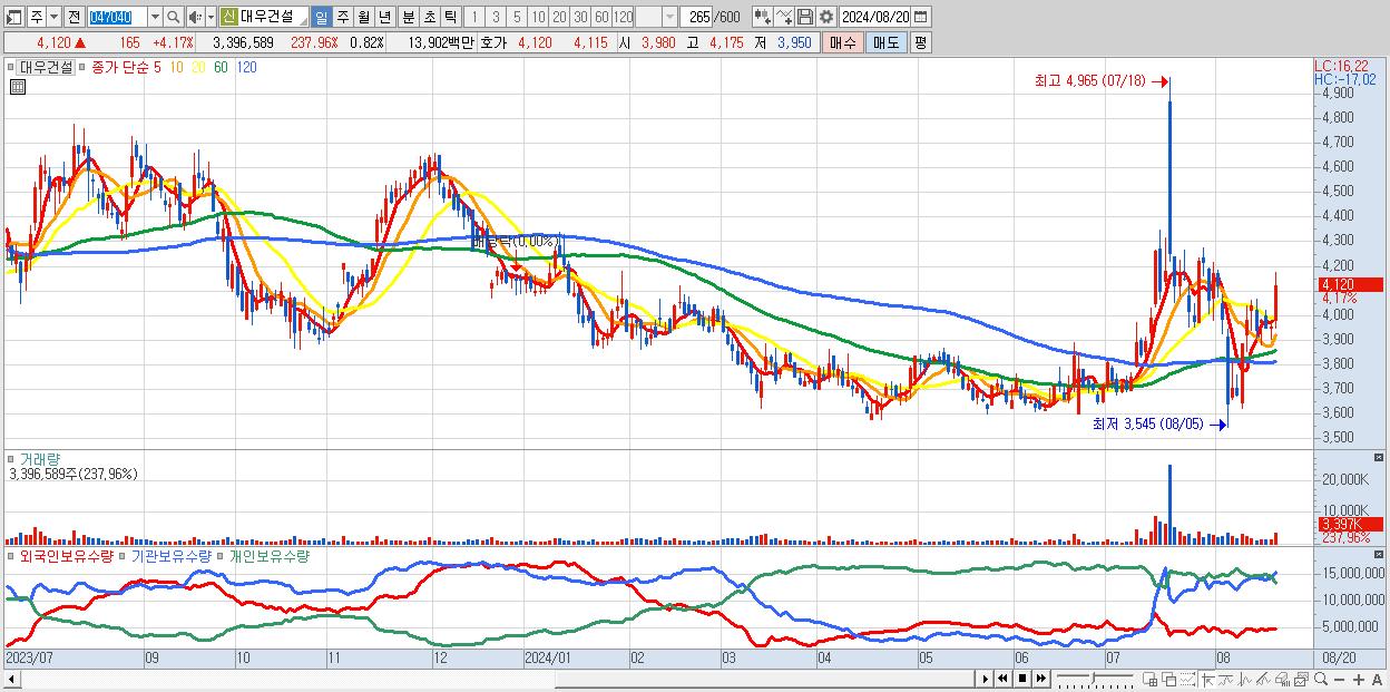 - 대우건설 (4,120원 ▲ 4.17% , 시총: 17,124억, 외국인 순매수 거래금:48억)