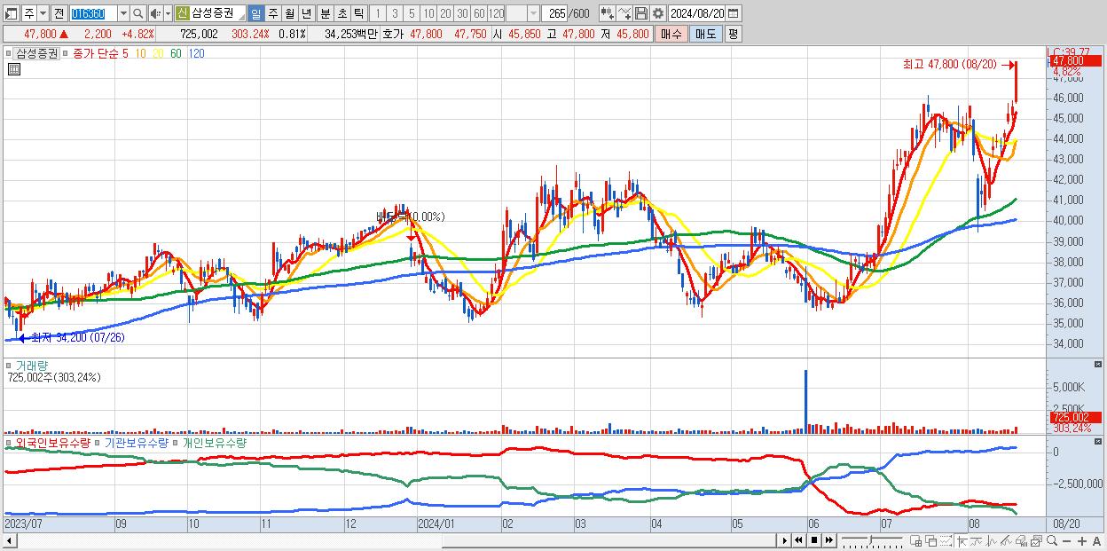 - 삼성증권 (47,800원 ▲ 4.82% , 시총: 42,685억, 외국인 순매수 거래금:165억)