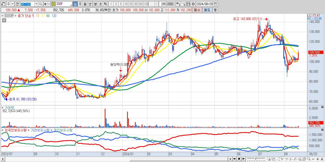 - SOOP (109,500원 ▲ 7.35% , 시총: 12,587억, 외국인 순매수 거래금:79억)