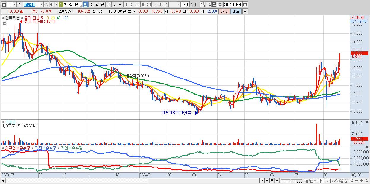 30.한국카본 13,350원 ▲ 5.87% (KOSPI, 017960)