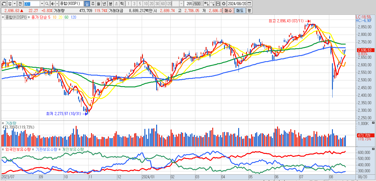 | 08/20 | 2,696.63 | ▲0.83% | -2,792억 | 2,890억 | 38억 | -136억 |